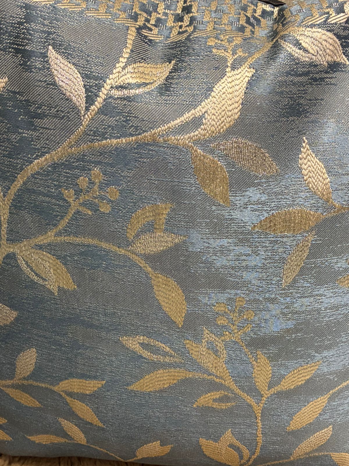 Set against a textured slate-blue backdrop, graceful golden vines unfurl across the surface in an intricate woven pattern. The botanical motif is delicately detailed, with softly raised threadwork that captures light beautifully — creating a subtle interplay of sheen and shadow.