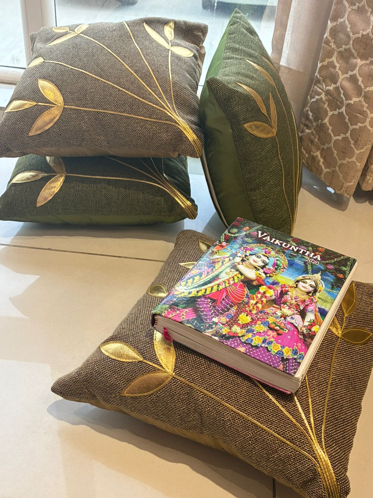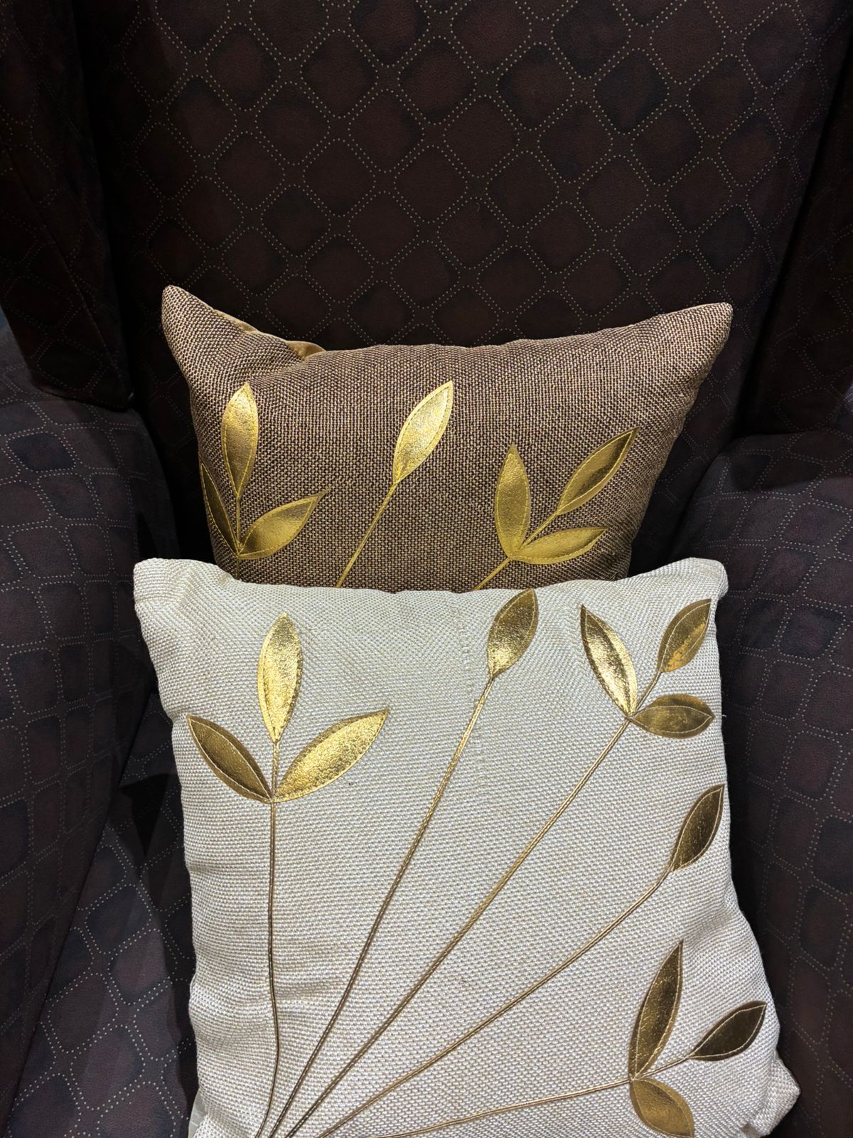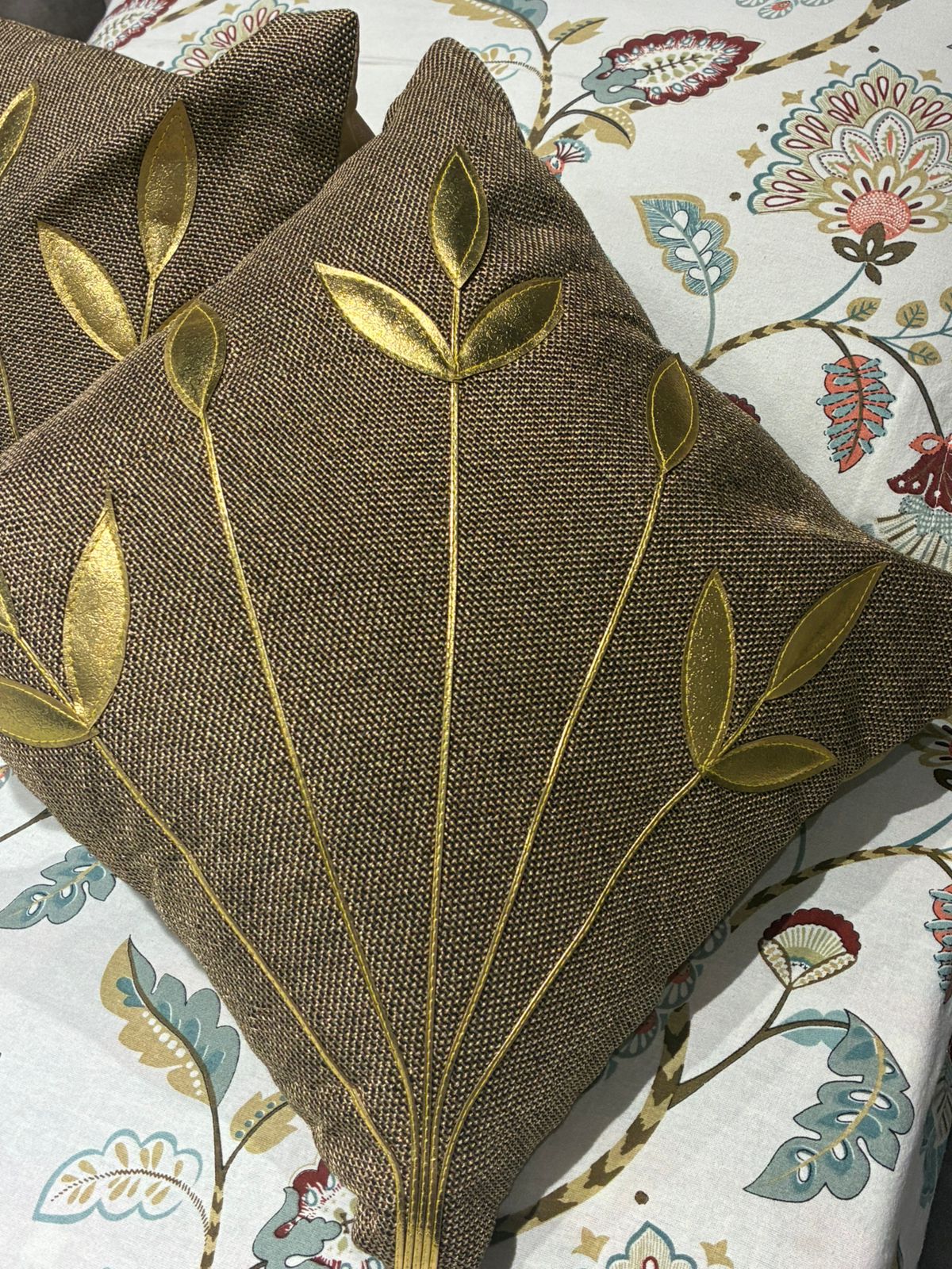 The design is enhanced with graceful gold botanical leaf motifs that radiate upward in a delicate, nature-inspired pattern. The subtle shimmer of the gold detailing contrasts beautifully with the deep brown fabric, creating a striking yet balanced decorative accent.