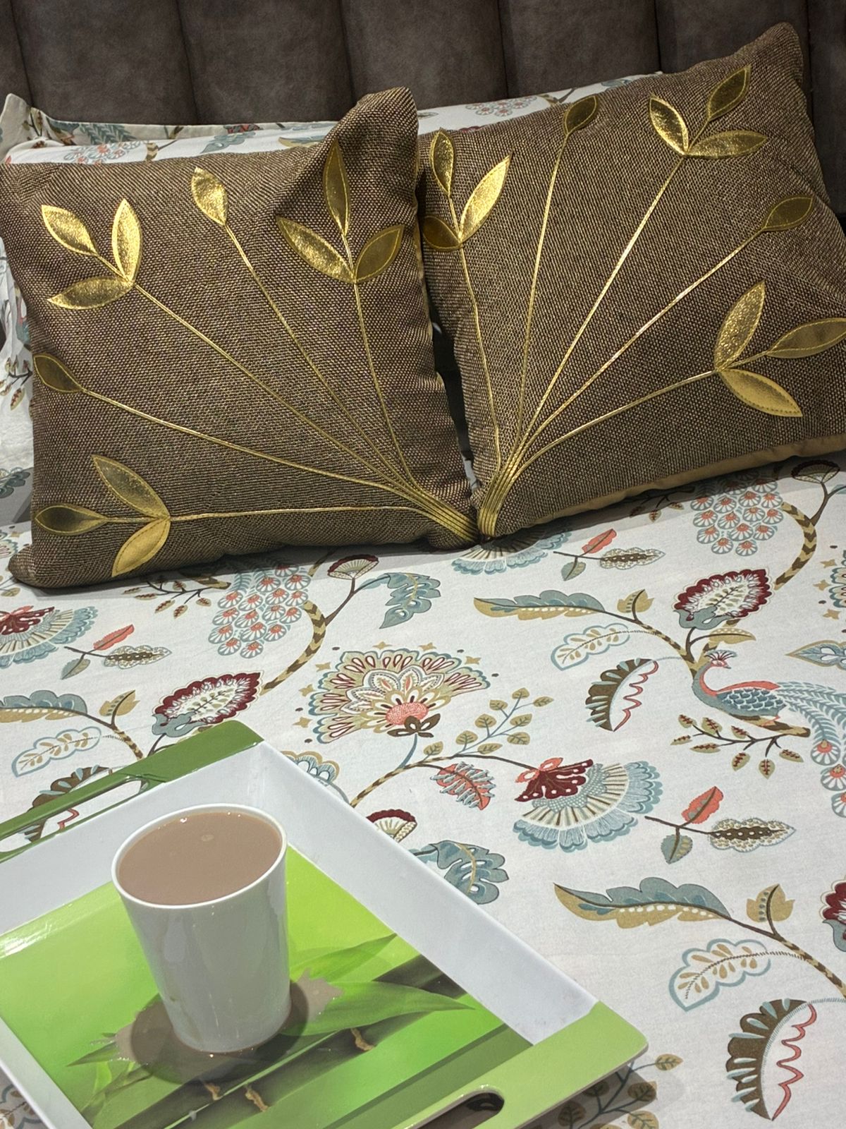 Mocha Brown & Gold Botanical Cushion Cover Set of -2