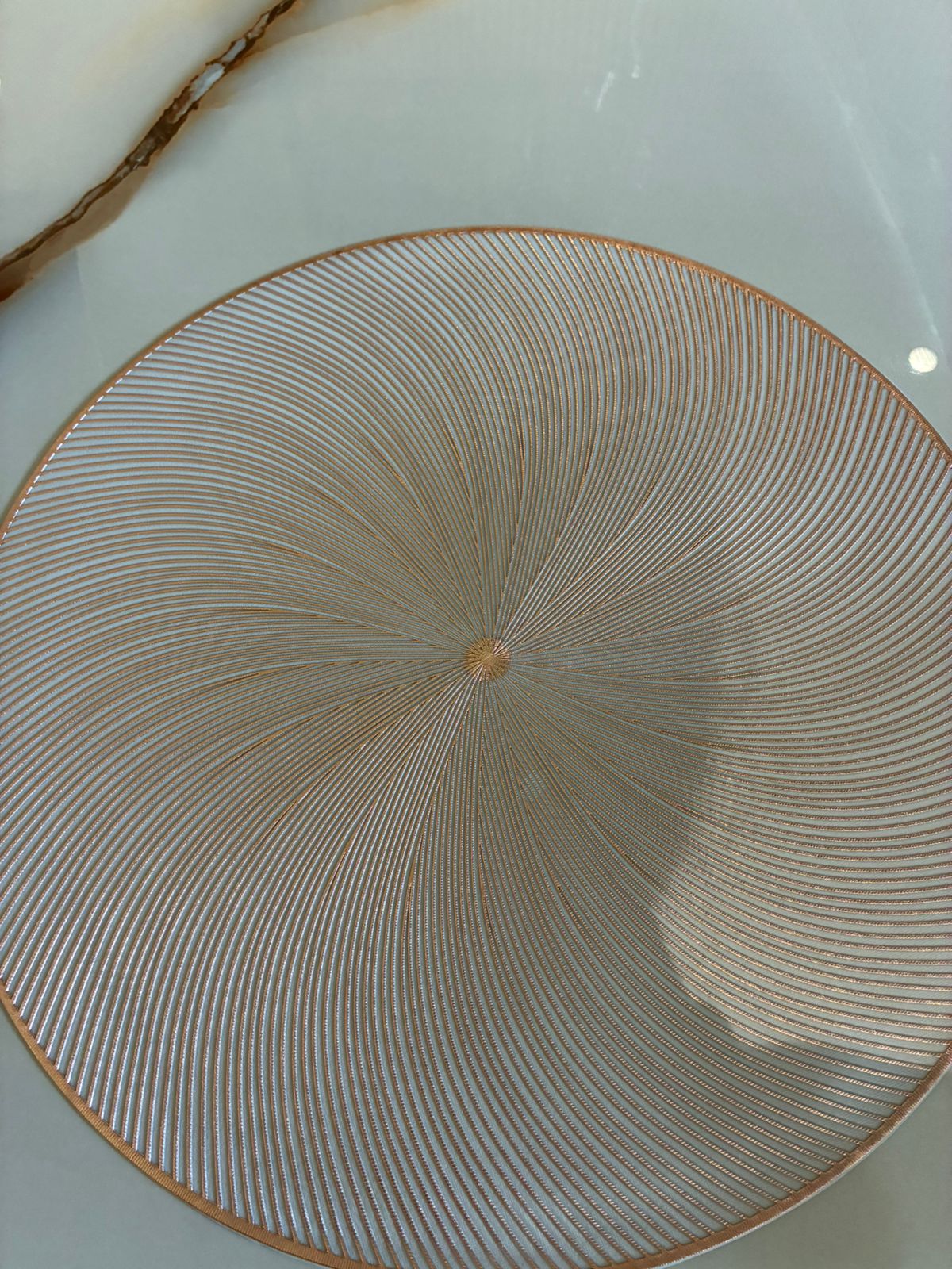 Bring a soft, romantic glow to your dining room with our Rose Gold Vortex Placemat. This unique design features a delicate rose gold metallic finish layered over a subtle off-white base, creating a multidimensional look that is both modern and timeless.